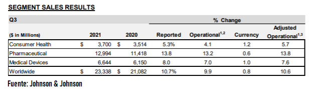 Hoy JNJ informó los números del tercer trimestre del ejercicio fiscal 2021. La compañía informó ventas por USD 23.300 millones (+10,7% interanual) y un beneficio de USD 1,37 por acción (+3% interanual).