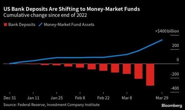 En este gráfico se puede ver la salida de depósitos de los bancos (en rojo) y los flujos de dinero hacia fondos monetarios (en azul).