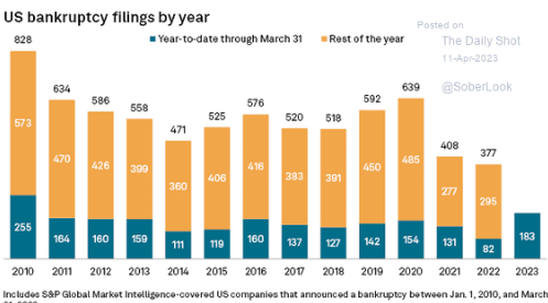 En el siguiente gráfico de S&P Global, puedes ver cómo siguen incrementándose las bancarrotas en Estados Unidos.