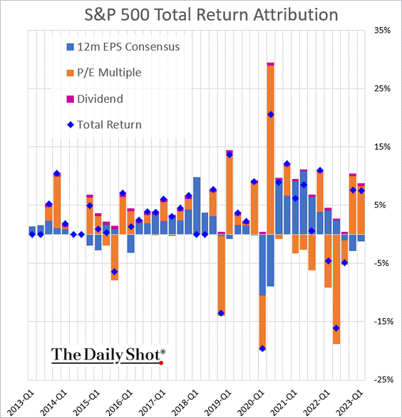 Si miramos cómo está compuesto el rendimiento total del S&P500 en los últimos meses, vemos que todo ha sido fruto de una expansión del múltiplo de valoración.