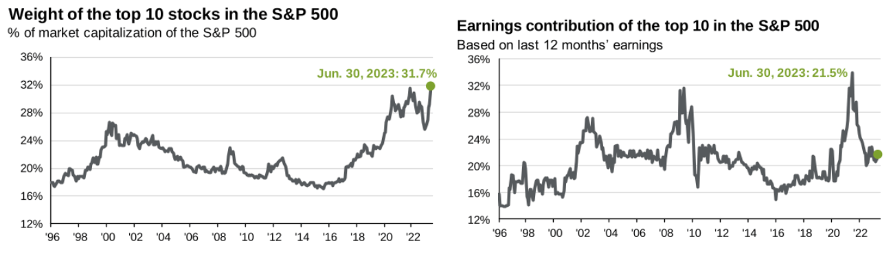 En segundo lugar, aunque estas diez compañías aportan una porción significativa de los beneficios totales, sus valoraciones están aumentando a un ritmo más rápido (lo cual podría indicar una sobrevaloración).
