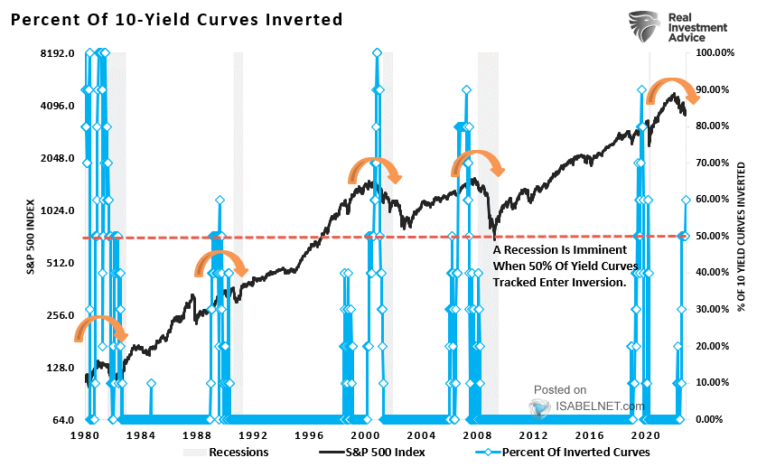 Un estudio realizado por Real Investment Advice, muestra que la recesión se avecina cuando el número de curvas de rendimiento invertidas supera el 50%, como sucede en la actualidad.