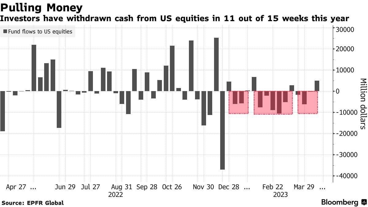 Si vemos este gráfico de Bloomberg, los inversores retiraron su dinero de las acciones en 11 de las últimas 15 semanas.