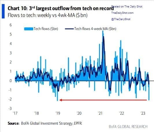 Esta podría ser una de las razones por las que se ven grandes salidas de fondos de las acciones tecnológicas, ya por tercera semana consecutiva.