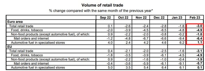 Además, en términos interanuales (febrero de 2023 frente a febrero de 2022), las ventas minoristas retrocedieron un 3%.