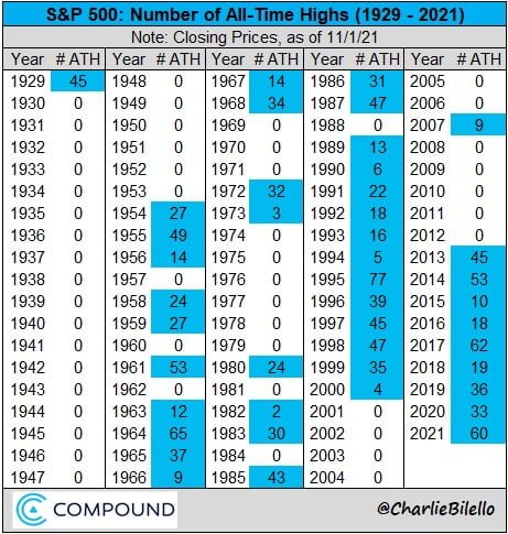 El S&P 500, el índice que rastrea a las quinientas compañías más importantes de los Estados Unidos, cerró ayer en un máximo histórico por sexagésima vez en 2021. Está a solo 18 veces del récord establecido en 1995, con 77 nuevos máximos históricos.