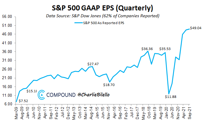 Un día antes del comienzo de esta temporada de reportes financieros, advertimos que, más allá de cuánto aumentaran las ganancias las compañías, lo más importante eran las proyecciones de ganancias futuras que exhibirían las empresas. La realidad es que, con el 62% de los reportes presentados al día de hoy, las ganancias del S&P 500 alcanzan un nuevo máximo histórico: un 49% más que en 2020.