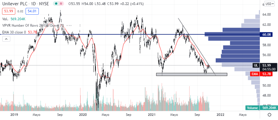 El volumen es alto, lo que podría ser una señal positiva para lograrlo. De ser así, UL podría tender a alcanzar la zona de USD 60, donde se encuentra el POC del perfil de volumen (el precio con mayor nivel de negociación en el período analizado).