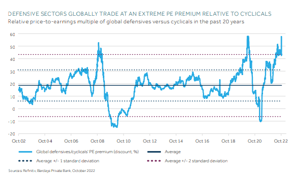 El problema es que, en la actualidad, la valoración de estas empresas es bastante exigente. Según un estudio de Barclays, las compañías defensivas cotizan con una prima del 46 % frente a compañías cíclicas, teniendo en cuenta los múltiplos sobre beneficios.