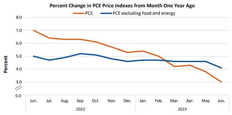 El PCE subyacente aumentó un 4,1% en junio, lo que representa el nivel más bajo desde septiembre de 2021 y está ligeramente por debajo de las expectativas del mercado, que eran del 4,2%.