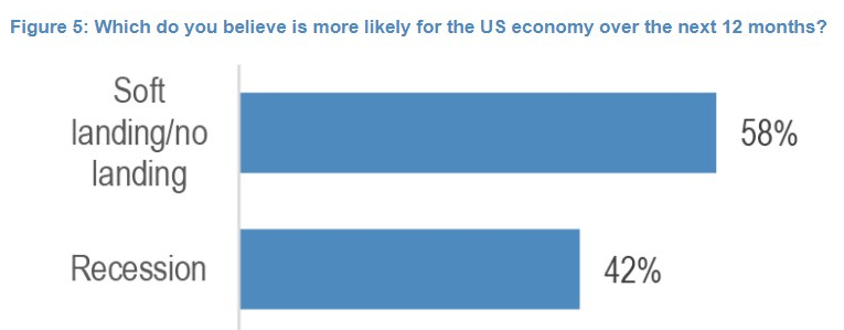 Una encuesta reciente realizada por JP Morgan a sus clientes reveló que el 58% de los encuestados piensa que la economía de Estados Unidos no caerá en recesión en los próximos doce meses y que tendrá un aterrizaje suave.