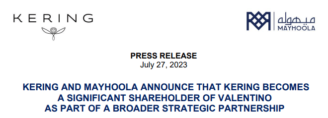 Este acuerdo también incluye una opción para que Kering pueda adquirir hasta el 100% del capital social de Valentino antes de 2028.
