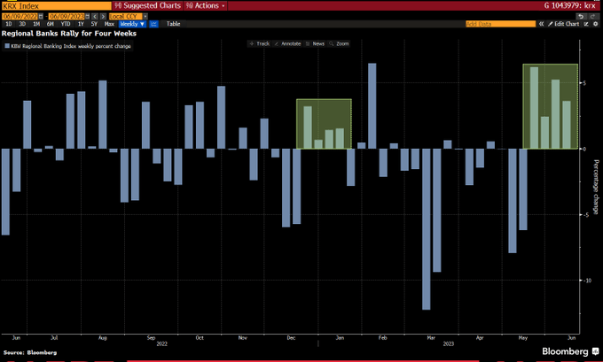 Y Burry no fue el único, ya que las acciones de los bancos regionales estadounidenses subieron durante cuatro semanas consecutivas.
