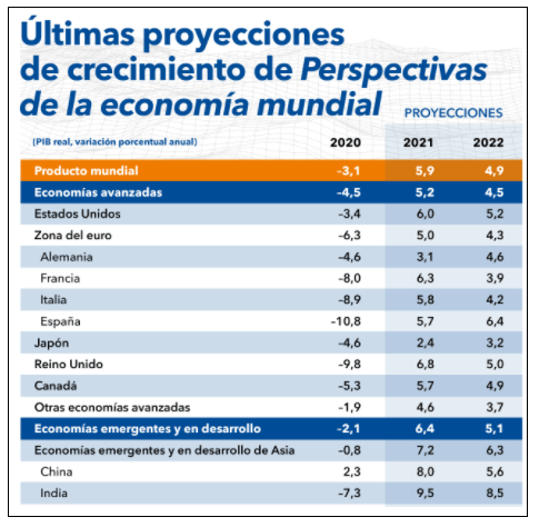 No obstante, la aceleración de la demanda y los brotes inflacionarios condicionaron al Fondo Monetario Internacional (FMI) a recortar sus proyecciones de crecimiento económico global para 2021. El producto interno bruto (PIB) crecería 5,9% en 2021 y 4,9% en 2022. La economía estadounidense crecería 5,2% este año y 4,5% en 2022.