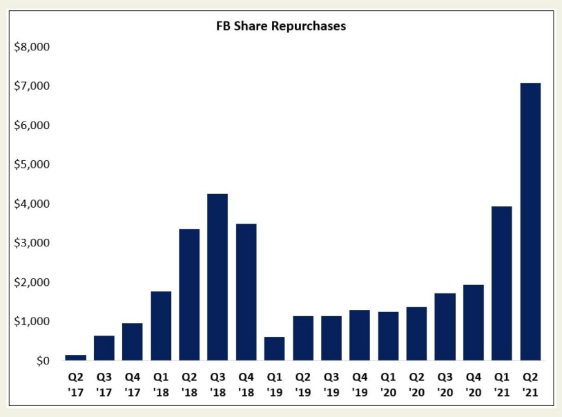 Como si esto fuera poco, FB está añadiendo valor al accionista mediante la recompra de acciones propias. En el segundo trimestre de 2021, compró acciones por más de USD 7.000 millones, la mayor recompra de acciones propias de su historia. Recuerda que es en momentos de pánico e incertidumbre donde se aprovechan las grandes oportunidades de inversión.